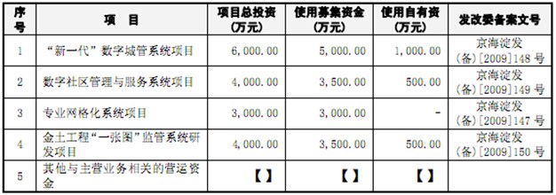 本次发行募集资金将投向以下四个项目:"新一代"数字城管系统项目、数字社区管理与服务系统项目、专业网格化系统项目、金土工程"一张图"监管系统研发项目,总投资1.7亿元,计划投入募集资金1.5亿元。