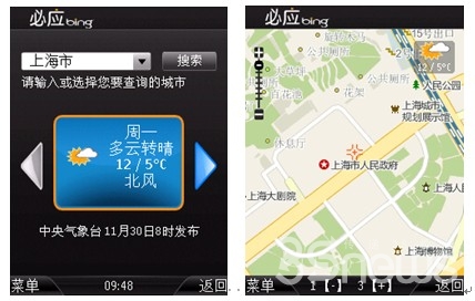 天气预报:手机必应搜索2.0可以查询连续三天的天气情况,无需用户手工输入,系统可以自动识别用户所在城市并提供所在城市的天气预报。更便捷的是用户也可以在地图搜索时,从地图浮层图标上时时了解所在位置的天气情况。用户在查询天气情况的同时还可以将查询结果通过短消息或MSN的途径与好友分享。