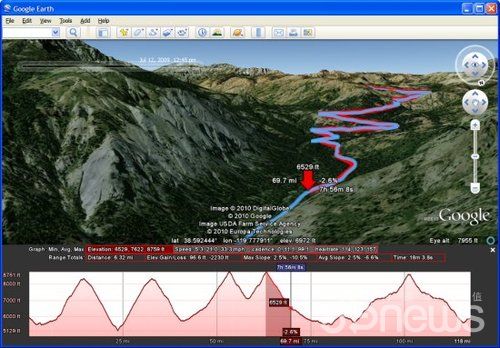 既然说到GPS数据追踪,就不能只考虑平面的经纬度问题,当然还要有海拔高度问题。新版Google Earth就可以做到,你可以将以前的KML文件重新导入一下看看,如果里面有海拔信息,现在就可以正常表示出来了。