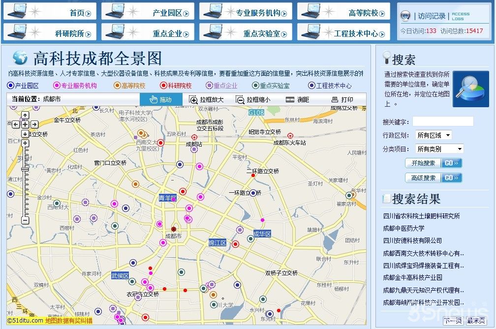 成都科技资源地理信息系统“高科技成都全景图”是集资源信息、服务指南、机构团队、电子地图等功能于一体,整合高校、院所、重点实验室、工程技术中心及重点企业等资源的数字化网上虚拟全域成都科技资源电子地图。全景图具有“可视、可看、可用”等功能,并为用户提供了电子地图基本功能服务、科技资源导航服务、科技资源查询与搜索服务、后台管理服务、呼叫中心系统等多种快捷的服务方式。