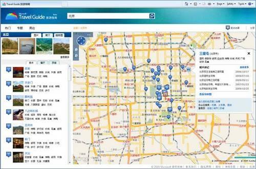 旅游指南功能由微软亚洲研究院与微软搜索技术中心合作研发,其研发宗旨是避免用户在旅游出行的搜索过程中浪费过多时间,同时能快速准确地获取最满意的搜索结果。用户通过旅游指南功能,不但可以第一时间获取与目标城市有关的旅游信息,还可以通过“驴友推荐”做进一步的辅助决策。用户只需在必应搜索栏输入诸如“桂林旅游”等字样,点击“驴友推荐”即可直接获取该旅游景点的第一手相关资料。当用户输入目标旅游城市的名字时,必应会将旅游城市按照旅游信息、周边景点推荐、景点介绍和城市游记等四个主要分类帮助用户全面了解目标景点和城市的主要信息,为用户提全面丰富的选择。点击相关链接进入旅游指南的详细页面后,用户还能在必应地图上浏览热门地点的相关信息。