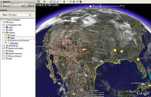 Google Earth是一款Google公司开发的虚拟地球仪软件,将卫星照片、航空照相和GIS布置在一个地球的三维模型上。最近,Google Earth发布了5.2版,新增雨雪天气实时演示模式,可看到全球大部分地区的云层和降水信息。Google官方博客介绍了Google Earth这一新功能。