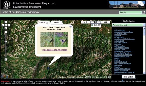 该图集使用Google Earth数据作为描述环境变化的底图。用户可以浏览全球信息,并进行国家间的对比分析。若将地图放大到某一感兴趣区域就可以实现某个国家或地区信息的浏览。此外,它还允许用户对热点地区的特殊信息要素进行查询,并提供了与其它相关网页的链接。该产品是一个通过Web发布的地图集,其中包括来自Google Earth应用程序的基础影像图和地图。联合国环境规划署这样的组织机构根本无需从头开始构建其Web地图集应用程序,通过这种手段,几乎就可以实现地图集的即刻出版。