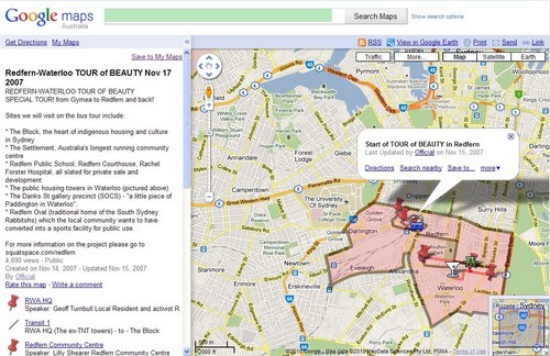 Squat Space曾组织过悉尼红坊区的“美丽旅程”活动。该活动邀请了当地居民来研究其居住区,从而帮助他们更好地了解居住区周围的各种环境要素,并为居民提供了一个相互交流的机会。最初,活动是通过一份附带文字说明的地图广告来进行宣传的,组织者希望对这一活动感兴趣的居民能够将其居住的地点标注在地图上,然后送还地图。信息被送回后一经整理,便会被标注出来。这些都是使用Google Maps完成的(如下图)。