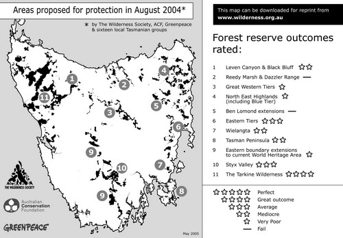 上图中的地图是由野生保护协会、澳大利亚保护基金和绿色和平组织共同完成的。野生保护协会通过使用Google Earth数据来显示森林砍伐的影响,其网站还会提供澳大利亚野生环境问题的即时信息。野生保护协会网页中还展示了塔斯马尼亚州森林砍伐状况示意图。该协会的塔斯马尼亚州砍伐图和维多利亚热带雨林网(VRN)制作的地图都准确地标识了被砍伐树木的位置,为该州判定木材砍伐所造成的影响提供了详实的证据。