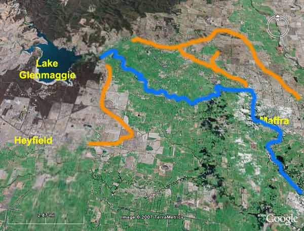 图中蓝色线条表示马卡利斯特河的大致位置,橙色线条表示2005年1月和11月受丙烯醛污染渠道的大致位置。根据该图分析,丙烯醛的残留物很有可能已经进入了马卡利斯特河。2007年4月13日《吉普斯兰时报》的报道称,马夫拉河的供水中尚未检测出除草剂和杀虫剂这类的化学物质。因此,丙烯醛应该还在汤普森河流域。