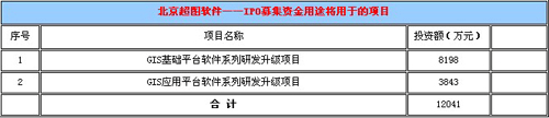 超图软件主要从事面向单位用户的、专业地理信息系统(GIS)平台软件的研究开发、产品销售和技术开发服务;本次发行募集资金拟投向GIS基础平台软件系列研发升级项目和GIS应用平台软件系列研发升级项目,共需投入募集资金1.20亿元。其中8198万元用于GIS基础平台软件系列产品的研发与升级,形成新一代GIS基础平台软件SuperMap GIS V7.0版本;3843万元用于GIS应用平台软件系列研发升级,即基于SuperMap基础平台,开发面向服务的地理信息共享交换平台、应急指挥管理平台软件、国土资源信息管理平台软件、面向服务的房产管理平台软件和专业导航应用开发平台软件等5个应用平台软件产品。项目总投资约1.2亿元。