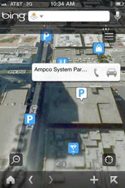 由于在手机上查看地图可能会出现多种信息交叠出现的情况,为了提供更好的用户体验,微软为重新设计了iPhone版Bing地图的界面。你会发现,地图的背景更深了,各种路况信息、商家名单和地图标注等以弹出窗口的形式出现,各个主干道路的字体大小也会相应变大,还添加了附近道路的标签。此外,地图视图和列表视图之间的切换也更加简单。