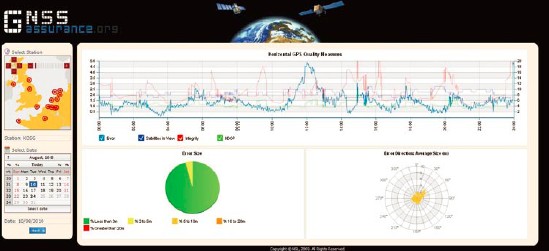 下图是GNSS Assurance网站的一幅截图。图中的分析结果包括定位误差、RAIM完整性、以及GNSS接收器输出的其它记录等(如可见卫星信息、水平精度因子)。网站提供了对GNSS质量非常具体的描述信息,并列举每日统计量和当前性能。