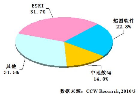 计世资讯(CCW Research)调查结果显示,2009年中国GIS基础平台软件市场品牌结构中,按照厂商的出厂销售额份额统计,排名前三位的厂商依次是ESRI、超图软件、中地数码,其中ESRI以31.7%的市场份额排名第一,超图软件以22.8%的市场份额排名第二,中地数码以14.0%的市场份额排名第三。计世资讯(CCW Research)研究认为,中国GIS基础平台软件市场集中度较高,前三家的市场份额之和接近70%。