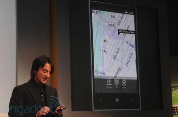 微软资深工程师Joe Belfiore在发布会上展示了Windows Phone 7的必应地图导航功能。用户在必应地图中点击手机的“搜索”硬件按钮,地图会自动找到用户目前所在的城市。如果在必应地图搜索框中输入单词,在这个过程中地图会自动进行提示,从此不再迷路。