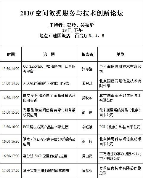 2010'空间数据服务与技术创新论坛将于10月29日下午将在西安建国饭店3、4、5号百合厅举行,会议将由彭玲、吴秋华主持。