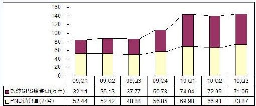 赛迪顾问市场监测数据显示,2010年前三季度中国改装GPS市场实现总销量218.08万台,比2009年同期增长107.7%,而与此同时,2010年前三季度中国PND市场实现总销量210.76万台,比2009年同期增长37.1%。