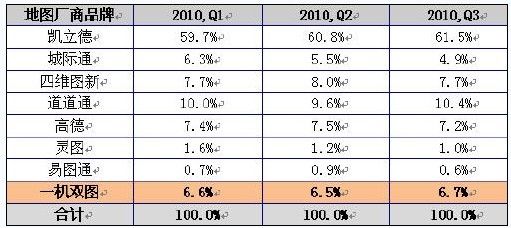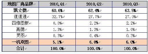 在进入到2009年年底之际,由于市场中开始大力推崇地图3D实景化,使得原本相对平衡的地图厂商格局出现了较大的变化。根据2010年前三季度中国改装GPS市场与同期的PND市场表现来看,两个市场品牌格局有很大的相似之处,七大图商分布并不均匀。总体就后装GPS导航地图市场而言,品牌分布相对往年更加集中,竞争格局已经基本定格。