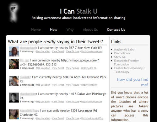 这些担心同时也延伸到了允许进行地理标签的服务商,知名的如Twitter。八月的时候我们曾报道了一个叫做I Can Stalk U的网站,警告了我们通过智能手机发布带地理信息标签的照片到类似Twitter等网站的危险性。