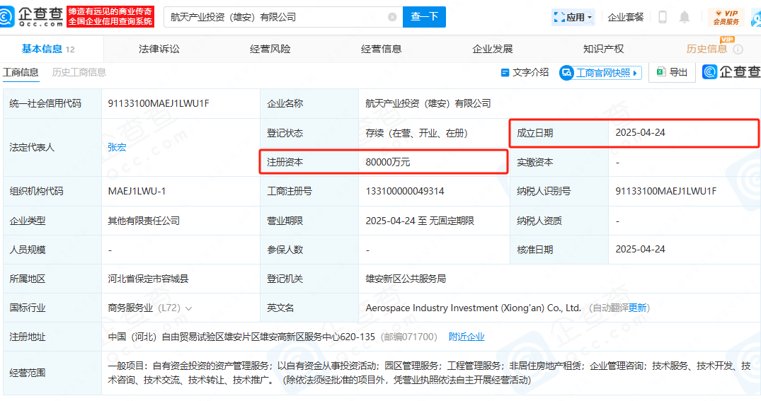 据企查查,4月24日,航天产业投资(雄安)有限公司(下称“航天产投”)注册成立,法定代表人为张宏,注册资本为8亿元,经营范围包含:自有资金投资的资产管理服务;以自有资金从事投资活动;园区管理服务;工程管理服务;非居住房地产租赁;企业管理咨询;技术服务、技术开发、技术咨询、技术交流、技术转让、技术推广。
