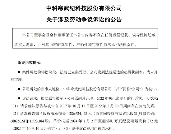 11月1日消息,日前,寒武纪突发公告,称遭前副总经理、CTO梁军以劳动争议起诉,索赔42.87亿元,该金额是公司2024年营收(11.74亿元)的3.6倍、2025年上半年营收(28.81亿元)的1.5倍。目前案件已立案受理,但尚未开庭审理。