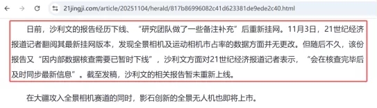 两份报告,两种截然不同的市场图景,也让近日全景相机的份额之争更值得深思。一份有上市公司财报、招股书等官方信息交叉验证,也有厂商确认作支撑,另一份则在反复修改后悄然“消失”。数据的背后,究竟是严谨的统计,还是另有考量?真相或许就藏在这些细节之中,留待每一位读者与市场参与者去辨别。