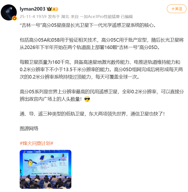 11月4日,微博用户lyman2003援引公开资料表示,长光卫星明年会建设“吉林一号”高分05星座,将成为下一代光学遥感卫星的核心。