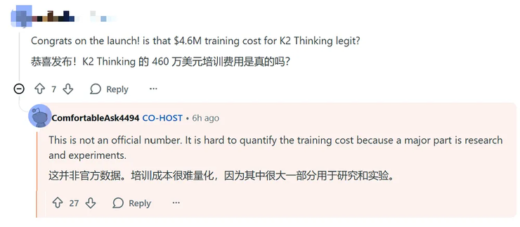 11月11日,月之暗面核心团队在社交媒体上举行了一场有问必答(AMA)活动,月之暗面联合创始人兼CEO杨植麟等人在Kimi K2 Thinking模型发布后不久,正面回应了模型训练成本、跑分与实际体验差距等热点议题。Kimi K2 Thinking模型训练成本仅为460万美元的网络传言喊得响亮,不过,杨植麟已经打假了,他称,这并非官方数据,训练成本很难量化,因为其中很大一部分用于研究和实验。他还透露,月之暗面已经在研究K2的VL(视觉-语言)版本了。