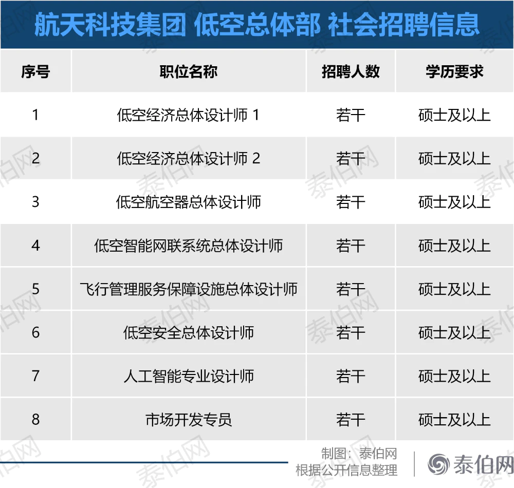 泰伯网讯,近日,航天时代低空经济总体部(简称“低空总体部”)发布社招公告,公开招募若干政策、技术及市场等岗位高级人才。