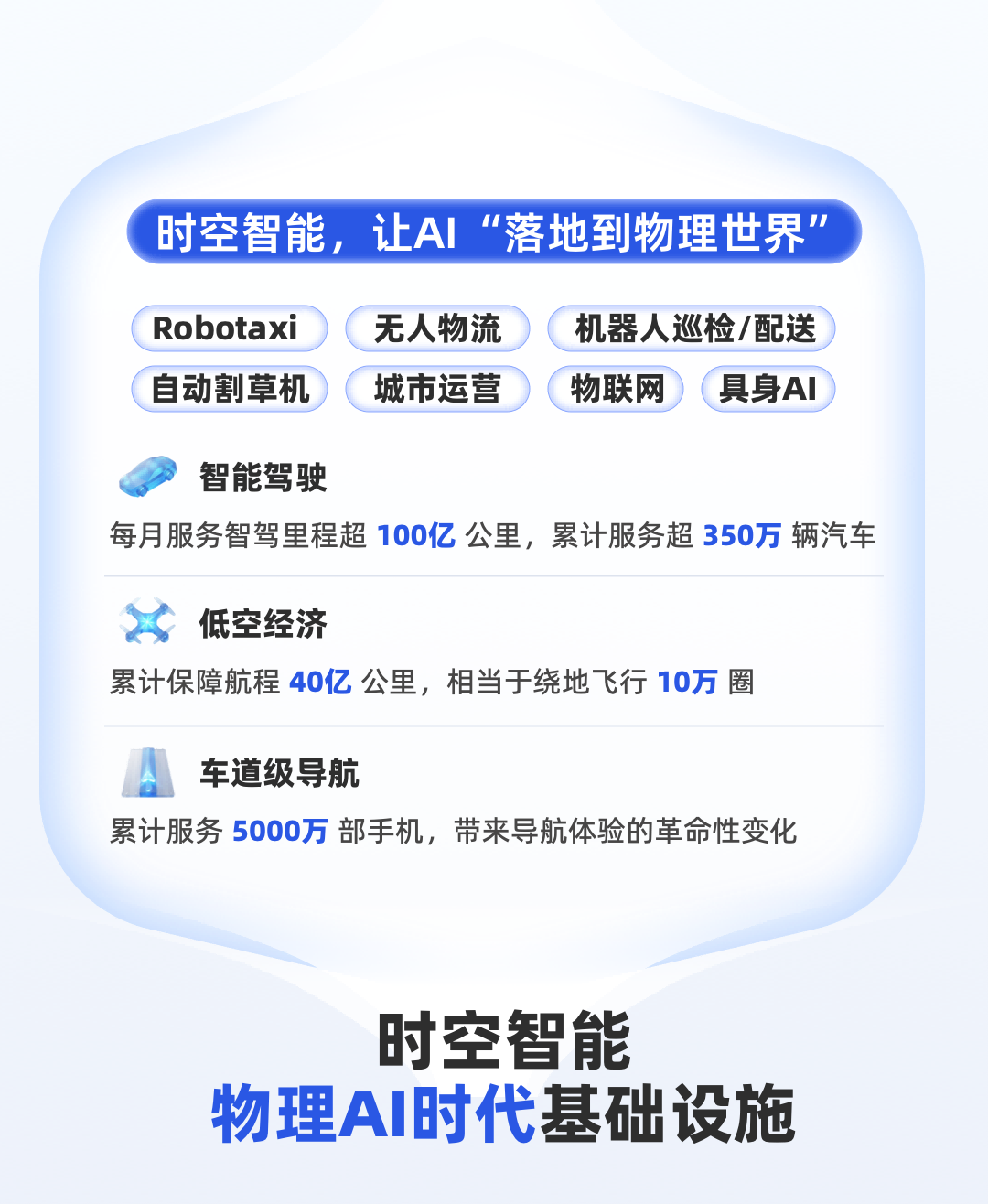 智能驾驶汽车、具身机器人、低空飞行器……得益于AI大模型的快速发展,这些智能设备具备了自身的思考决策能力,跟整个现实世界的交互性得到了明显的加强,调用了大量的时空智能服务。