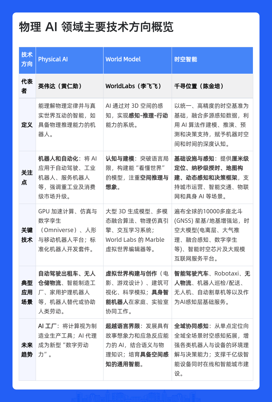 物理AI(Physical AI)已经成为AI发展的下一个浪潮,而时空智能则是“物理AI”的空间基础设施,为AI在现实世界行动提供必要的“神经系统 + 感知地图 + 物理常识”,让各类AI智能体不仅知道自己的位置,还能感知其他智能体的位置。目前,国内外的科学家正在研究世界模型,让AI能够像人类一样,借助观察和体验,循序渐进地学习认知物理世界的常识。