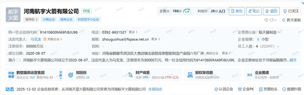 据企查查,12月2日,“河南天章火箭有限公司”发生企业名称变更,公司更名为“河南航宇火箭有限公司”(以下简称:航宇火箭)。