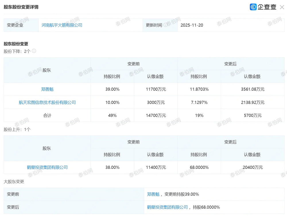 泰伯网讯,近日,航天宏图信息技术股份有限公司(以下简称“航天宏图”)投资的火箭企业先后完成股东股份变更与企业名称调整。