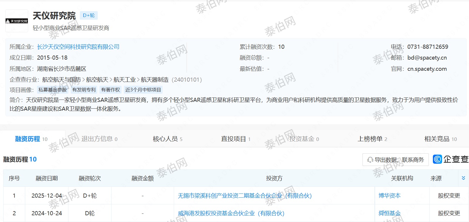 泰伯网讯,12月5日,企查查平台信息显示,天仪研究院获得博华资本D+轮投资。