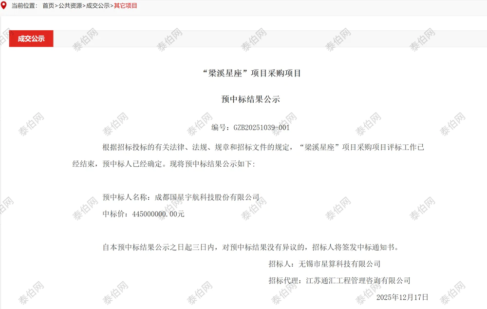 泰伯网讯,12月17日,无锡产权交易所官网公示“梁溪星座”采购项目预中标结果。预中标人为“成都国星宇航科技股份有限公司”(简称“国星宇航”),中标价4.45亿元。