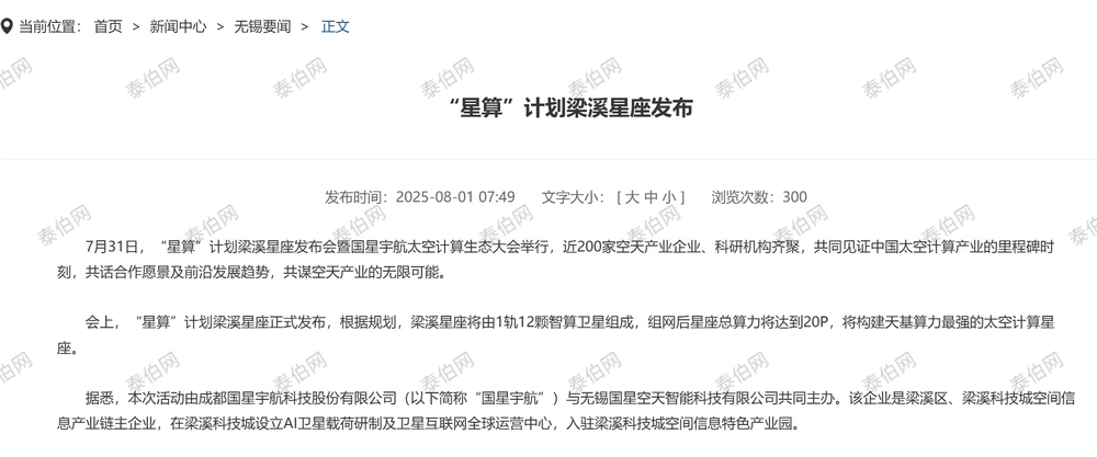 此前,国星宇航与无锡市梁溪区已有合作。据无锡日报,国星宇航是无锡梁溪区、梁溪科技城空间信息产业链主企业,在梁溪科技城设立AI卫星载荷研制及卫星互联网全球运营中心。