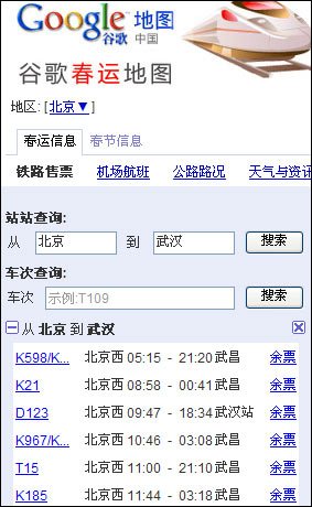 谷歌春运地图默认是搜索是铁路售票。此次的铁路售票提供了“站站查询”和“车次查询”两种查询方式。新增的“余票”信息可提供十日内的车票结果,方便大家制定出行计划。此外还提供了车票代售点的交通信息,帮助大家寻找最便捷的购票渠道。如用户要从北京到武汉,可以在站站搜索中敲入“武汉”,就会出现车次、车次时间是否有“余票”。
