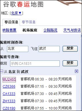 谷歌春运地图还提供了机场航班查询:可以航班搜索和班次查询,并可查看航班所在的机场航站楼信息。今年谷歌地图与酷讯旅游合作,提实时的铁路和民航相关路线和票务信息。如果用户想进一步了解车次信息可点击进去查询,就进入了酷讯旅游网站。